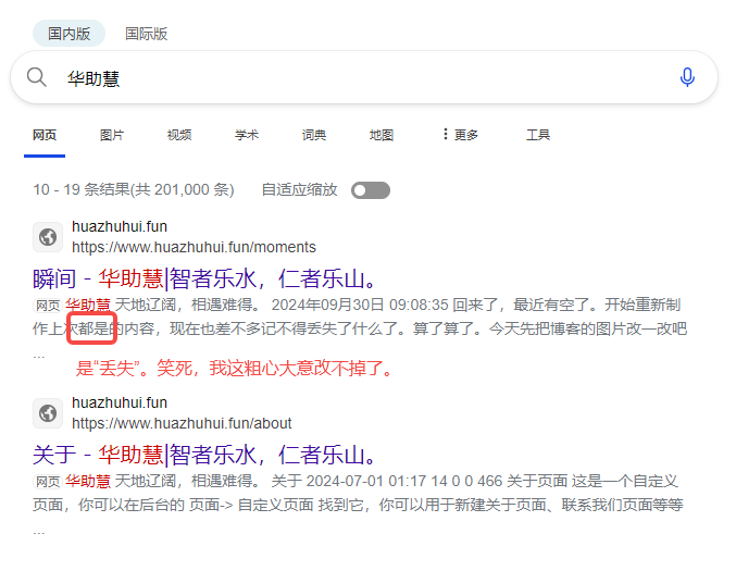 今早在必应上搜索了“华助慧”,搜索结果看到上次更新的一些内容,但点进去是找不到页面。(因为我现在又回滚到了8-27,最近的更新内容都是无用功。但内容应该都被爬虫爬到了,所以能搜到摘要。)